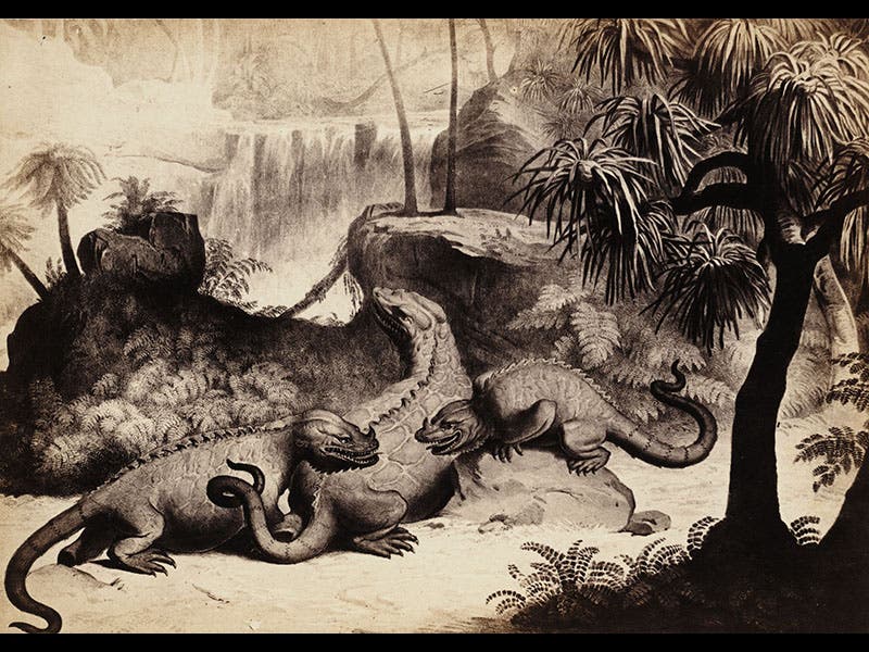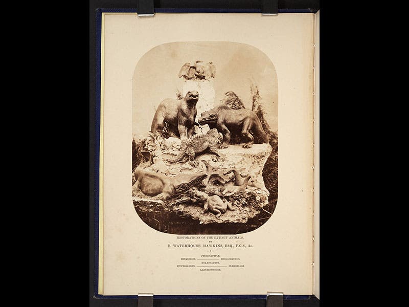 Franz Unger, a Viennese botanist, was born Nov. 30, 1800. Unger wrote a number of books on prehistoric life; today we feature Die Urvelt (1851), a large plate-book that contains 14 sizeable lithographs depicting different periods in Earth history, such as the Muschelkalk (what we would now call the Middle Triassic) or the Weald ( Early Cretaceous). As a pioneer paleobotanist, Unger paid more attention to the plants than the prehistoric animals that walked among them, but he did include his share of amphibians, reptiles, and invertebrates such as ammonoids. Sometime before December of 1859, an English translation of Die Urvelt was published as Ideal Views of the Primitive World, with the plates reduced in size. We do not have Die Urvelt in our collection, but we do have The Primitive World. What makes the book especially interesting is that the original lithographs were photographically reduced and then printed as photographs. This is one of the earliest books in our collection to have actual photographic prints as images. We reproduce three of them here: the Weald, with three dinosaurs, two Iguanodon and a Hylaeosaurus (first image); the Muschelkalk, with ammonites and a Nothosaurus giganteus prospecting for dinner (second image); and the frontispiece (third image), which shows a cluster of Benjamin Waterhouse Hawkins’ miniature dinosaur models, a scene posed and photographed especially for this edition of Unger’s book. In addition, we show the attractive gold-embossed front cover, and the rear endpaper (fifth image), an advertisement for a publication on dinosaurs by Hawkins, "to be published in December, 1859,” which allows us to date this publication.