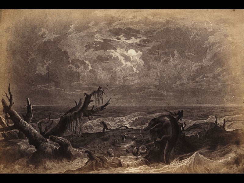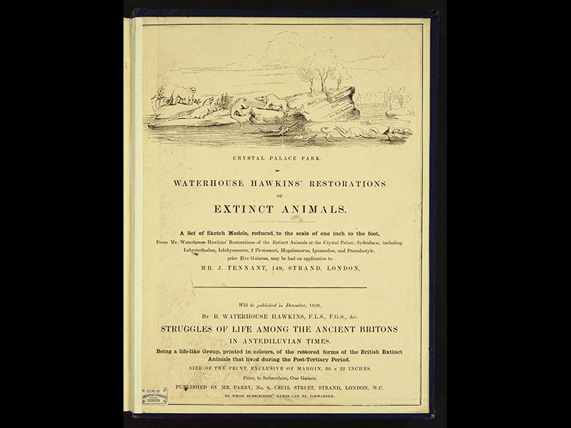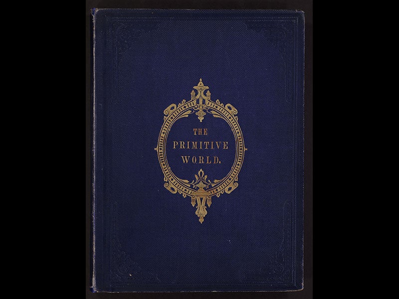 Franz Unger, a Viennese botanist, was born Nov. 30, 1800. Unger wrote a number of books on prehistoric life; today we feature Die Urvelt (1851), a large plate-book that contains 14 sizeable lithographs depicting different periods in Earth history, such as the Muschelkalk (what we would now call the Middle Triassic) or the Weald ( Early Cretaceous). As a pioneer paleobotanist, Unger paid more attention to the plants than the prehistoric animals that walked among them, but he did include his share of amphibians, reptiles, and invertebrates such as ammonoids. Sometime before December of 1859, an English translation of Die Urvelt was published as Ideal Views of the Primitive World, with the plates reduced in size. We do not have Die Urvelt in our collection, but we do have The Primitive World. What makes the book especially interesting is that the original lithographs were photographically reduced and then printed as photographs. This is one of the earliest books in our collection to have actual photographic prints as images. We reproduce three of them here: the Weald, with three dinosaurs, two Iguanodon and a Hylaeosaurus (first image); the Muschelkalk, with ammonites and a Nothosaurus giganteus prospecting for dinner (second image); and the frontispiece (third image), which shows a cluster of Benjamin Waterhouse Hawkins’ miniature dinosaur models, a scene posed and photographed especially for this edition of Unger’s book. In addition, we show the attractive gold-embossed front cover, and the rear endpaper (fifth image), an advertisement for a publication on dinosaurs by Hawkins, "to be published in December, 1859,” which allows us to date this publication.
