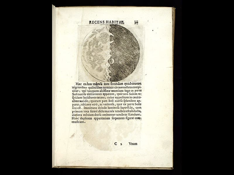 When Galileo first looked at the Moon through his telescope in 1609, he noted one especially large “cavity” near the center of the Moon that he compared (in his book, Sidereus nuncius, 1610) to the appearance of Bohemia on Earth, when viewed from above. You can see the crater, as Galileo depicted it in one of the engravings in Sidereus, in the second image above. Occasionally, scholars have wondered how Galileo knew what Bohemia looked like from the air--he had never even seen it from the ground--until one researcher ran across a map of Germania in the world atlas of Abraham Ortelius (1570). Sure enough, Bohemia is shown there, surrounded by a circular ring of mountains, looking very much like Galileo’s circular cavity. In most copies of the Atlas, Bohemia is colored differently from the rest of Germania, making it stand out even more. We have a 1592 edition of Ortelius in the Library, and we see above the entire engraved map (third image) and a detail of Bohemia (fourth image. Galileo must have seen such a map and was able to recall the crater-like appearance of Bohemia when he beheld his large crater on the Moon.