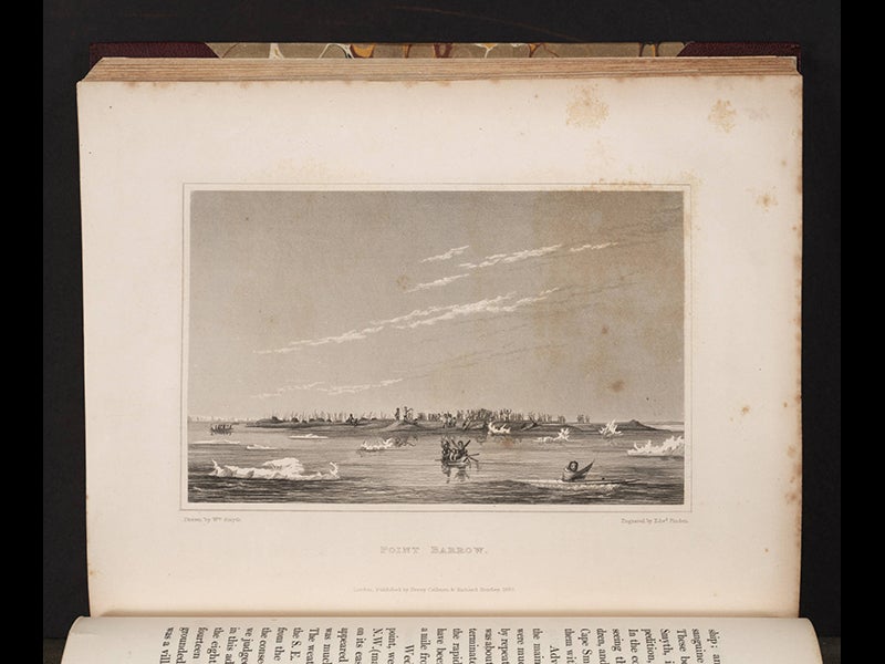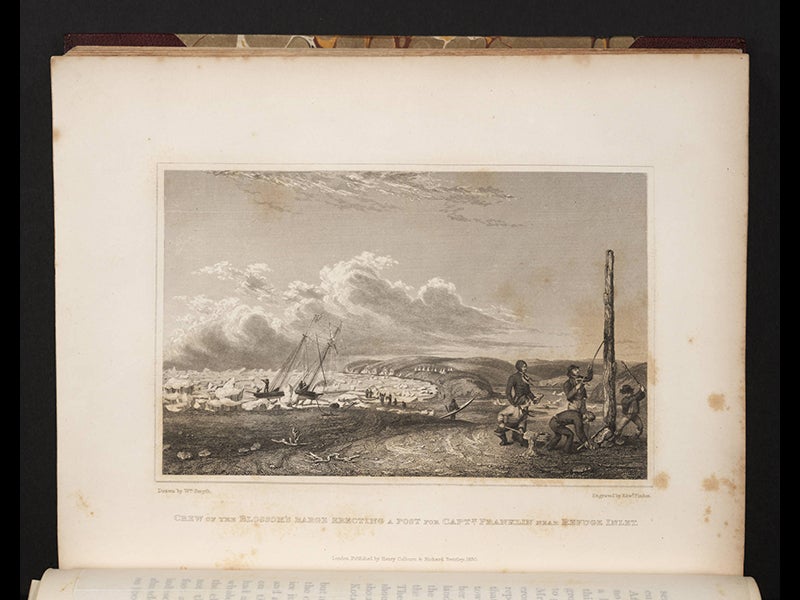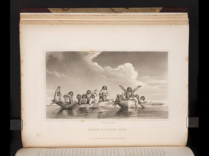 Frederick William Beechey, an officer in the British Royal Navy, was born Feb. 17, 1796. When the British Admiralty embarked on a campaign to discover a Northwest Passage across North America, Beechey was in from the beginning, sailing with John Franklin in 1818 and Edward Parry in 1819. In 1823, Franklin embarked on an overland journey up through Canada, following the Mackenzie River to the Arctic sea. He was then to go west toward the Bering Sea, and Beechey was sent out in command of HMS Blossom to around the horn to the Bering Sea and rendezvous with Franklin. The Blossom got all the way to Point Barrow (which Beechey discovered and named), but Franklin never made an appearance (he had to turn around when still a few hundred miles east of Point Barrow). Nevertheless, Beechey explored much of what is now the Alaskan coast and encountered the native Inupiat peoples. Beechey was one of many Royal Navy officers who were both scientifically and artistically trained, so he was able to illustrate his narrative with his own sketches, four of which you see above. The fourth image shows Beechey erecting a marker post to let Franklin know they had made it this far.