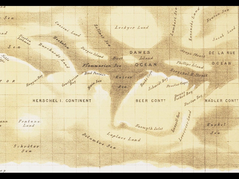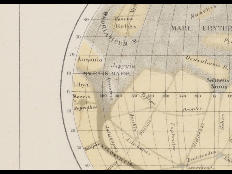Frederik Kaiser, a Dutch astronomer, was born June 10, 1808. Kaiser was director of the Leiden Observatory, and in 1862, he began observing Mars with the observatory telescope. In 1862 and 1864, Mars was especially close to earth--astronomers call such situations "favorable oppositions"--which means the surface features on Mars were clearer than unusual, and many astronomers used the opportunity to study the red planet. Kaiser compared his drawings with those of Robert Hooke and Christian Huygens two centuries earlier, and he was able to calculate the exact length of a Martian day: 24 hours, 37 minutes, 22.6 seconds. So esteemed was Kaiser as an observer that when Robert Proctor in 1867 named all the features on Mars after astronomers, he called the most prominent feature the "Kaiser Sea." The first map of Mars above (first image) was drawn by Nathaniel Everett Green during the opposition of 1877 and published in 1879; the Kaiser Sea is at the right, looking like a fat tornado, and appearing even more prominent in a detail of that region (second image). It was called a "sea" because it was presumed, in the 1870s, that the dark features on Mars were water and the light areas were land.