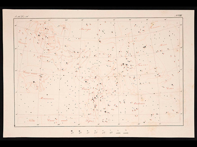 Argelander chose to return to the days of the original Uranometria, by limiting his atlas to the visible stars. But he also wanted to recognize that the constellations were not the show-stoppers anymore--the stars were. So Argelander's star atlas depicted the constellations with very faint outlines, and to emphasize the connection with Bayer's Uranometria, he used the very same figures that Bayer had used, as we see with Argelander’s version of Orion (second image, with first image detail). When he had to add constellations that Bayer did not employ, as with the 10 constellations invented by Johannes Hevelius, he did not copy Hevelius, but rather provided new figures in the style of Bayer (third image, where Leo minor and the Sextant are new constellations, and Cancer and Leo are traditional). The novel feature of the Uranometria nova was the star positions; no splashy stars, instead there are small dots, very accurately placed. Argelander's Uranometria nova is at once the last of the constellation-dominated grand atlases, and the first of a new kind of professional star atlas, designed for the single purpose of positioning the stars on a grid that will be useful to the observatory astronomer.