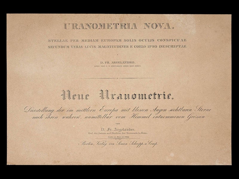 Many years ago we displayed an exhibition of celestial atlases, Out of This World: The Golden Age of the Celestial Atlas. The Golden Age began with Bayer, and it ended with Argelander, as the Uranometria nova was the last atlas in our exhibition. We produced a lovely printed catalog, but time has not been kind to the electronic version, one of the first of its kind on the web, and it badly needs a face lift. Nevertheless, here is the page on Bayer’s Uranometria, and the final page, featuring Argelander’s Uranometria nova.