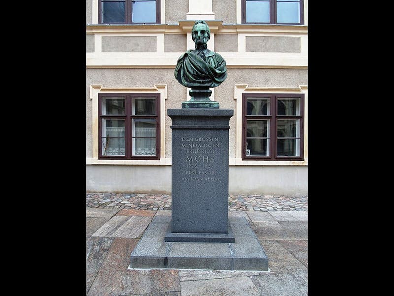 Mohs went on to succeed the great mineralogist Abraham Werner as professor at Freiberg in 1817, and then became professor of mineralogy in Vienna in 1826. He is remembered in Graz by a bust in what is now the Universalmuseum Joanneum (first image). But his greatest monument has to be a memorial plaque erected by the citizens of Vienna to honor their adopted mineralogical son. It depicts Mohs and his scale, with each of the ten Mohs minerals shown in colorful relief (third image). One would suppose that the diamonds at the top are not real.