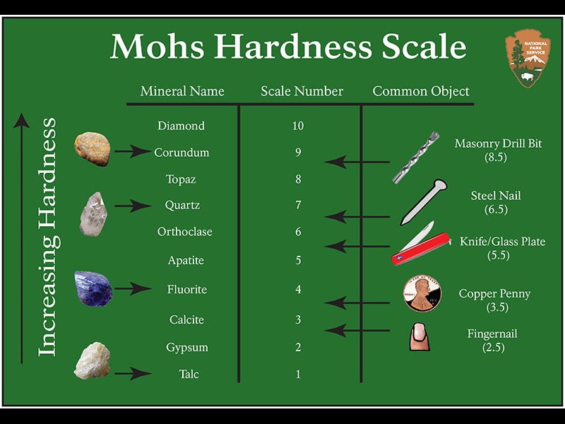 The Mohs scale is unusual in that the numbers don't mean anything except rank. Calcite (3) is three times harder than gypsum (2), but corundum (9) is twice as hard as topaz (8), and diamond (10) is four times as hard as corundum (9). This makes the Mohs scale quite different from everyone's other favorite 1-to-10 scale, the Richter earthquake scale. On the Richter scale, a magnitude 6 quake is precisely 10 times more energetic than a magnitude 5 quake, and a magnitude 7 quake is 10 times greater than a 6. You can actually calculate the energy of an earthquake from its Richter number. The Mohs scale, on the other hand, does not really tells us anything except what mineral scratches what.