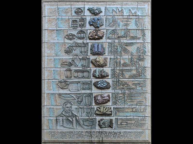 Mohs went on to succeed the great mineralogist Abraham Werner as professor at Freiberg in 1817, and then became professor of mineralogy in Vienna in 1826. He is remembered in Graz by a bust in what is now the Universalmuseum Joanneum (first image). But his greatest monument has to be a memorial plaque erected by the citizens of Vienna to honor their adopted mineralogical son. It depicts Mohs and his scale, with each of the ten Mohs minerals shown in colorful relief (third image). One would suppose that the diamonds at the top are not real.
