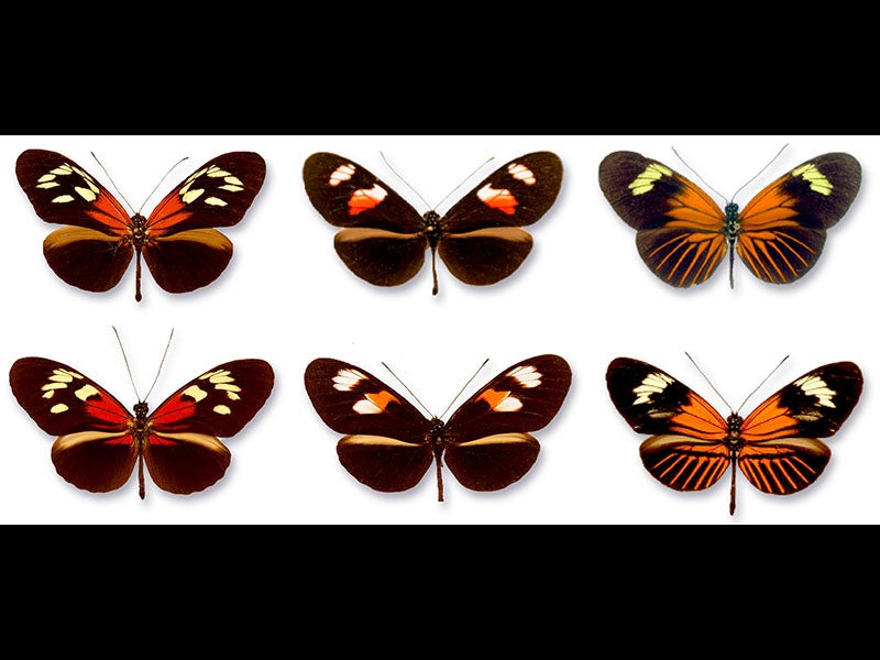 Müller discovered a different form of mimicry, where two noxious and unrelated species come to resemble each other, so that each benefits from the other’s unpalatable taste. It was discovered in 1991 that the Viceroy butterfly is far from tasty, and is even more repellant to predators than the Monarch. So the Viceroy and Monarch are now the new classic examples of Müllerian mimicry. The examples that Müller himself offered were Heliconius butterflies, many of the species of which are dead ringers for other species of the same genus (second image) The top row of the image shows one set of species of Heliconiuis; the bottom an entirely separate set of species.