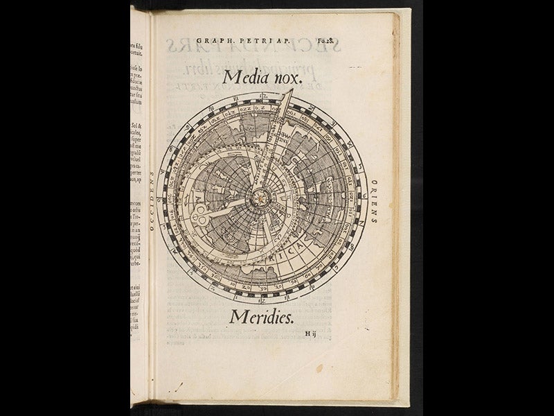Reiner Gemma Frisius, a Flemish mathematician and geographer, was born Dec. 8, 1508. In 1528, Gemma moved to Louvain, where he set up an instrument workshop, at the same time continuing his education in medicine, which he would eventually practice. As a result, Gemma was one of the best educated instrument makers in Renaissance Europe, able not only to design a theodolite or an astrolabe, but to reflect on how instruments can change our views of the world. He edited new editions of Peter Apian's Cosmographia, which was originally published in 1524 in Ingolstadt. Cosmography was a unique 16th-century science, a combination of cosmology and geography that tried to help the reader view his place on the earth and in the cosmos. The Gemma Frisius editions of Apian first appeared in 1529 and rapidly become the most popular books on cosmography available. We have three editions in the Library; the one of 1550 contains the most widely reproduced woodcut of the ancient geocentric cosmological system of Aristotle, then being challenged by Copernicus (see first image above).