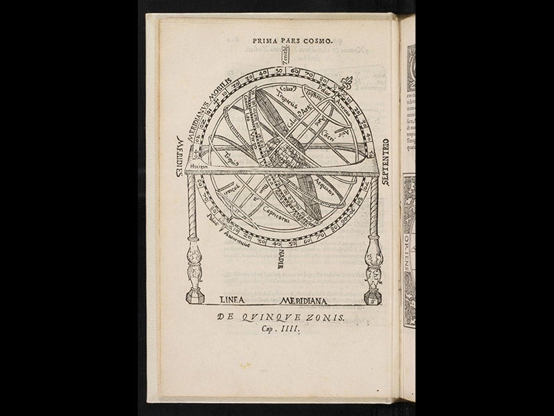 The other attractive feature of Gemma Frisius's Cosmographia are the volvelles--sets of printed paper devices that rotate and point to allow the reader to picture the changing length of the seasons or times of sunrise and sunset around the earth. We reproduce two of the volvelles from our 1550 edition above (second and third images). Volvelles are easily torn out or lost or never installed in the first place, so it is especially nice when they have remained intact for 460 years, as both of these have. The fourth image above, from the same source, shows a diagram of the five climate zones of the earth.