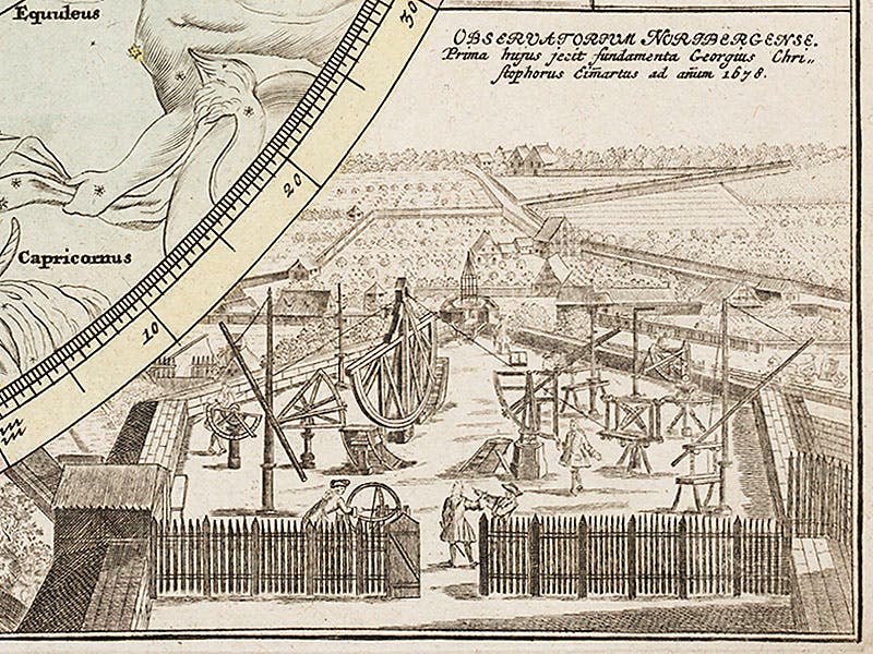 Georg Christoph Eimmart, a German astronomer and artist, was born Aug. 22, 1638. In 1678, Eimmart founded an astronomical observatory in the Vestnertorbastei, a garden area within a low wall just north of Nuremberg Castle. Unlike Tycho Brahe's pioneer observatory at Hven in Denmark, where each instrument was protected by a conical dome, Eimmart's observatory appears to have been an open-air affair. Several images survive of Eimmert's garden of sextants and transit circles; the one we have in our collection is an inset on a large star map that was included in Johann Doppelmayr's Atlas coelestis (1742; first image). Doppelmayr was a Nuremberger himself and was happy to showcase Eimmart's observatory, along with those at Greenwich, Paris, and Hven.