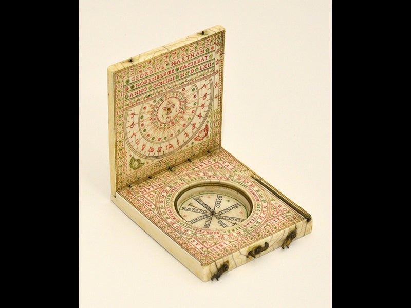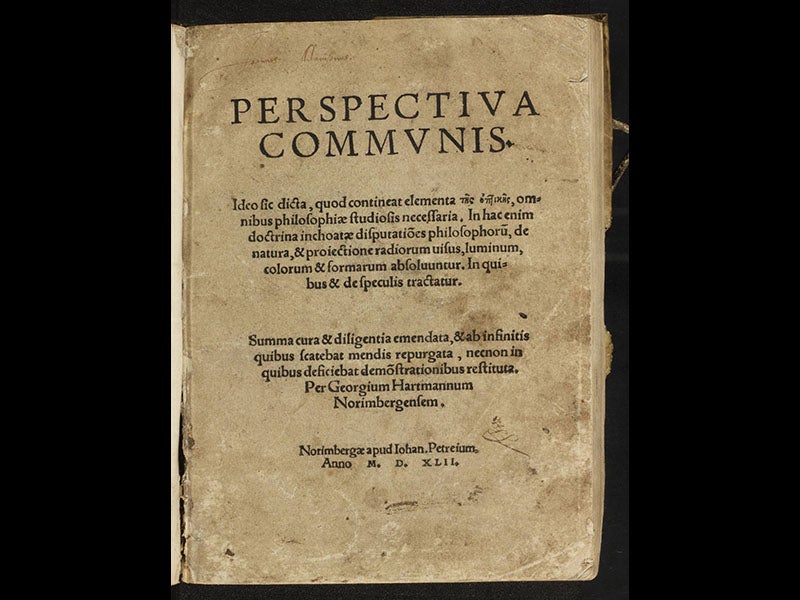 Georg Hartmann, a German instrument maker, was born in Bavaria on Feb. 9, 1489. After a variety of studies and travels, he settled in Nuremberg in 1518. There he established a career and reputation as a consummate technician, producing astrolabes, sundials, and globes. Quite a number of his instruments survive, including an astrolabe in the Peabody Museum at Yale (first image) and a folding ivory dial with compass at the Oxford Museum of the History of Science (second image). Unlike many instrument makers, Hartmann was university educated, so he took a break from engraving brass to edit John Peckham's Perspectiva communis for publication. This optics manuscript had been written in the 1280s but did not see the light of print until Hartmann saw it through the press in 1542. The publisher of the book, Johannes Petreius, was at the time knee deep in page proofs for Copernicus’s De revolutionibus, which would come out the next year (1543), but he did a good job on Peckham’s Perspectiva (as he did with all his scientific texts), and we have a copy of the Hartmann/Petreius/Peckham work in our History of Science Collection (third image).