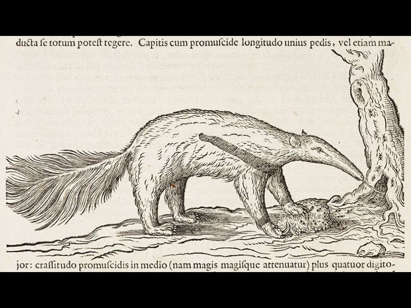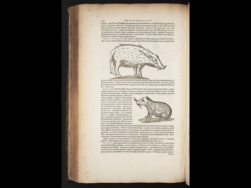 Georg Markgraf, a German astronomer and naturalist, was born Sep. 20, 1610. In 1638, he departed for Brazil to enter the service of Count Johan Maurits of Nassau, who had just taken command of the Dutch sugar colony at Recife. One of Markgraf's responsibilities was to collect information on the animals of Brazil. This he did, writing short descriptions and commissioning illustrations from life of a host of animals unknown to Europe, such as the howler monkey, the capybara, and the great anteater. Markgraf was then sent to Angola, where he died in 1644, but his zoological manuscripts survived and were edited by Johannes de Laet for inclusion in a folio publication of 1648, Historia naturalis Brasilae, by Willem Piso. The illustrations above are all taken from this book, which we have in our Collections. You will notice that Markgraf's descriptions are relatively brief and straightforward: "The Brazilian coati is a fox the size of a cat; it has short claws and hands like a monkey," etc.