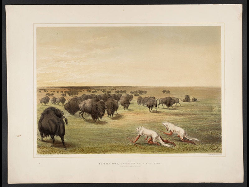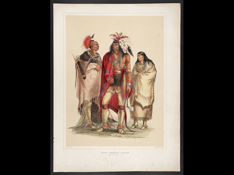 In 1844, Catlin had published a small selection of his paintings as prints, in what he called the North American Indian Portfolio. We have this portfolio in the History of Science Collection, and for our Science Goes West exhibition in 2004, all thirty-one plates were displayed, mounted on the walls of the old exhibit room. They provided a very dramatic "surround" for the other books on display. Five of these can be seen above. At the time of our exhibit, many of the original Catlin oils were at the nearby Nelson Gallery, as part of a national tour. You can see a selection of these at a Smithsonian virtual exhibition. The portrait of Catlin (sixth image) is also at the Smithsonian, in the National Portrait Gallery