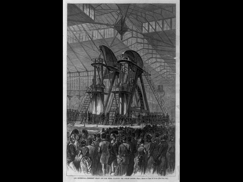 At the 1876 Centennial Exhibition in Philadelphia, meant to showcase America's newfound industrial power, the central fixture was a mammoth operating Corliss steam engine, which powered everything else at the fair (first image). It was built by Corliss at his factory in Rhode Island and donated to the Exhibition. Other Corliss engines were installed in factories all across the country, and some are still running; a photo above of an operating engine in Providence provides a good view of the valve gear and wrist plate (fourth image). The Science Museum in London also has an operating Corliss engine, which they call "Big Red" (fifth image).