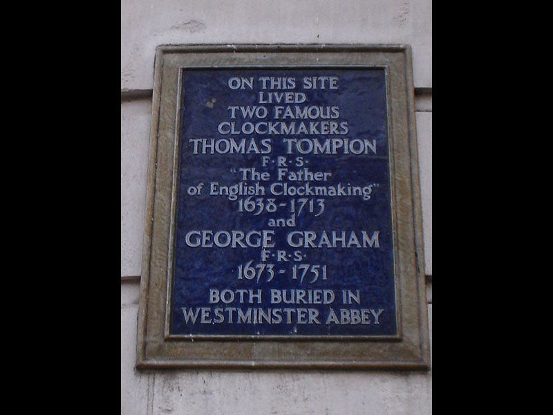 Graham was later inducted into the Royal Society of London, and when he died in 1751, he was buried in Westminster Abbey (interestingly, sharing the grave of his predeceased colleague, Thomas Tompion). There is a plaque honoring both Tompion and Graham at the site of their shop in London (fifth image).