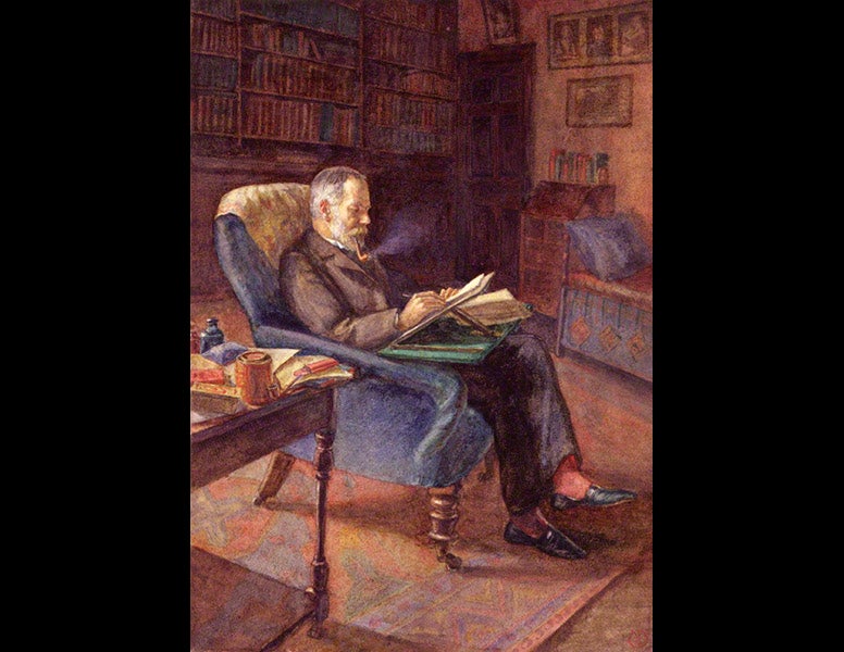 The watercolor portrait of Sir George was drawn by his daughter, Gwen Raverat, and is now in the National Portrait Gallery, London (first image). There is a brass plaque honoring Darwin (in Latin) in Trinity College chapel (fifth image).