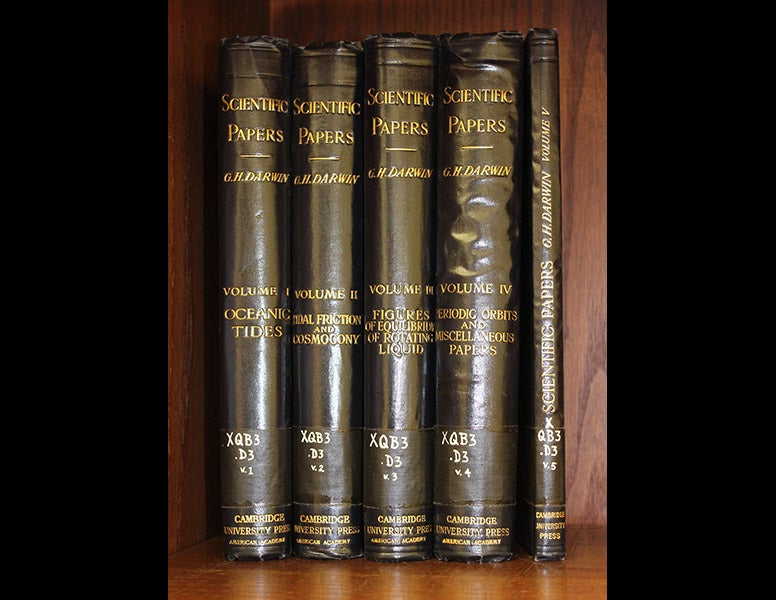 Darwin published over 80 papers in various scientific journals, most we which we have in our serials collection. But it is often more convenient to consult them in his 5-volume Scientific Papers (1907-16), because Darwin thoughtfully grouped them by subject, so that all the papers on “Tidal Friction and Cosmology”, for example, are in the first volume (second image).