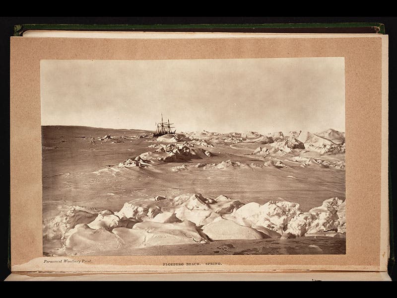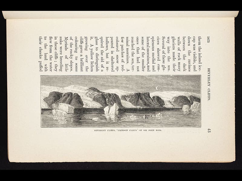 The Library recently acquired the two-volume Narrative of a Voyage to the Polar Sea (1878), written by Nares. The first five images above are all from this work. This was one of the first books on Arctic exploration to be illustrated primarily by photographs, and one of the perhaps unintended results was to show how bleak the Arctic really is. Most of the earlier books on the search for a Northwest Passage had been illustrated with hand-colored engravings and chromolithographs, which made the northland look positively inviting. Not so with the photographs in Nares’ Narrative. There are also a number of wood engravings in the book, and we show one (fifth image) that depicts a stretch of cliffs that, the caption tells us, had been earlier visited by Sir John Ross. This gives us an excuse to display an earlier hand-colored engraving, from Ross’s account (1819) of his visit to the Crimson Cliffs (sixth image), and you can see what we mean about the false charm of early depictions of the Arctic.