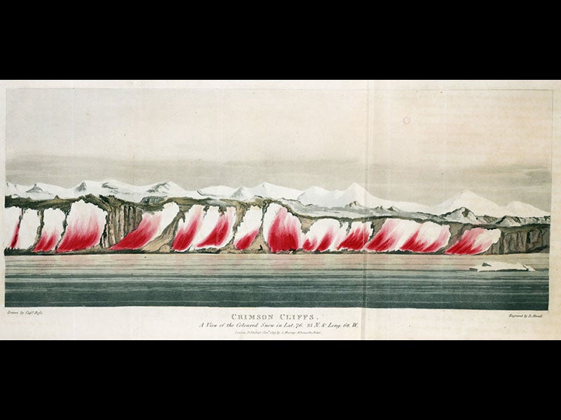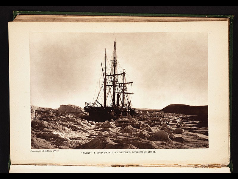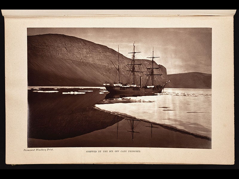 The Library recently acquired the two-volume Narrative of a Voyage to the Polar Sea (1878), written by Nares. The first five images above are all from this work. This was one of the first books on Arctic exploration to be illustrated primarily by photographs, and one of the perhaps unintended results was to show how bleak the Arctic really is. Most of the earlier books on the search for a Northwest Passage had been illustrated with hand-colored engravings and chromolithographs, which made the northland look positively inviting. Not so with the photographs in Nares’ Narrative. There are also a number of wood engravings in the book, and we show one (fifth image) that depicts a stretch of cliffs that, the caption tells us, had been earlier visited by Sir John Ross. This gives us an excuse to display an earlier hand-colored engraving, from Ross’s account (1819) of his visit to the Crimson Cliffs (sixth image), and you can see what we mean about the false charm of early depictions of the Arctic.