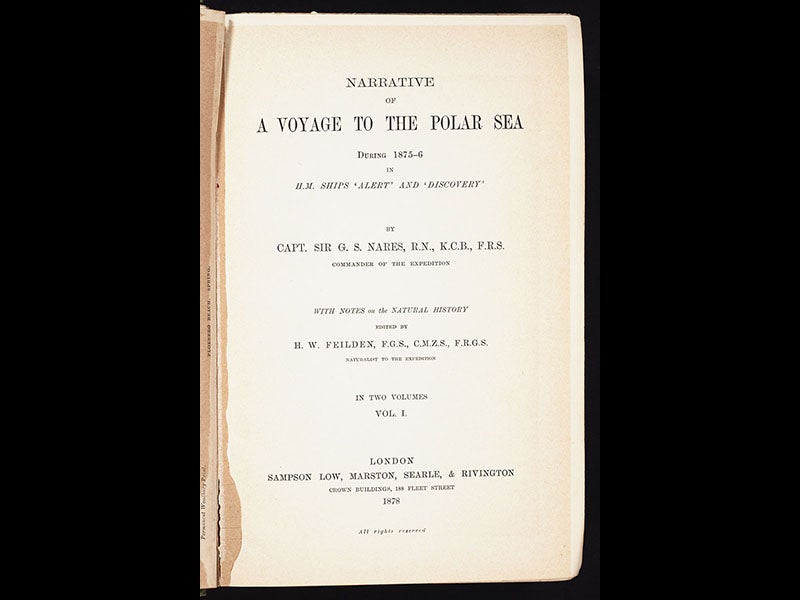 George Strong Nares, a British naval officer and explorer, died Jan. 15, 1915, at age 83. Nares was the commander of the Challenger expedition, 1872-76, the hugely successful scientific voyage that, through world-wide soundings and dredging, greatly enlarged our knowledge of the deep-ocean floor in both the Atlantic and Pacific Oceans. Today, however, we focus on Nares’ next, and less distinguished, voyage of exploration. In 1875, Nares set off in two ships, the Alert and the Discovery, to attempt to reach the North Pole by sailing up the western coast of Greenland. Many at that time still believed in the existence of an Open Polar Sea, which, if one could reach it, would provide easy ship access to the North Pole. Nares took his ships up through the strait that separates Greenland from Ellsemere Island (now called the Nares Strait), but they found no Polar Sea; there was instead–surprise–nothing but increasingly colder ice. A sledge expedition did made it to 83° 20’ N, a record at the time, but otherwise the expedition was a complete bust, and Nares even came home early–a real no-no for a British naval officer–since many of his men were suffering from scurvy, in spite of the fact that it was by now well-known how to prevent scurvy. The major impact of the expedition was to make the British swear off further Arctic expeditions for the next quarter of a century. In spite of his lackluster performance, but in keeping with the best spirit of the Peter Principle, Nares, upon his return, was given awards by all sorts of scientific societies, made a knight commander of the Order of the Bath, and eventually promoted to Vice-Admiral.