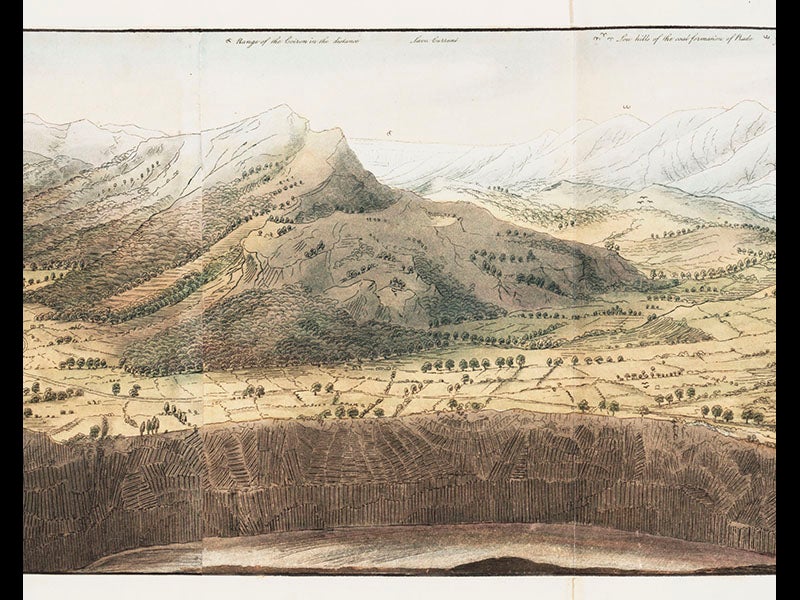 George Poulett Scrope, an English geologist, was born Mar. 10, 1797. In the early 1820s, Scrope visited the mountainous region of south-central France, which included areas known as the Auvergne, the Velay, and the Vivarais. Fifty years earlier, French geologist Nicolas Demarest had revealed that the mountains of the Auvergne were actually extinct volcanos, and Scrope wanted to see for himself. He found that Desmarest was right--there was basalt everywhere, hundreds of feet of it in distinct layers, all apparently disgorged from volcanoes now long extinct. He published a book on the region in 1827, called Memoir on the Geology of Central France; it took five years to publish because of the elaborate folding hand-colored panoramic engravings that he included in the volume of plates. We see three of the plates here; the first shows the region of the Auvergne that includes the Puy de Dôme, the tallest mountain (and extinct volcano) in the region (see first and second images above). The second folding plate depicts an area to the east, in the Vivarais, near the city of Jaujac, where they are thick layers of basalt criss-crossing one another that were subsequently eroded by a river (images three, four, and five above are from this one plate). The third panorama shows an area near Le Puy en Velay, where a lone monastery sits atop a basalt puy or butte (sixth and seventh images).