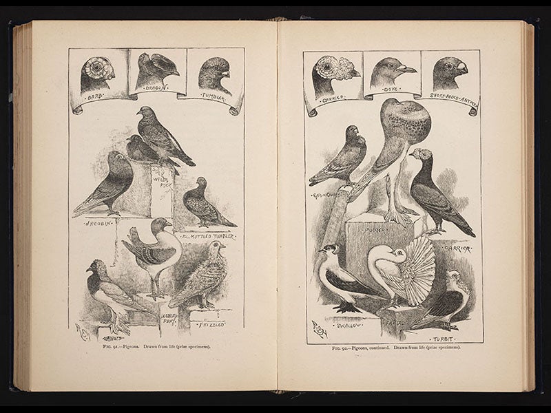 Romanes believed that geographical isolation was important in evolution, but Darwin did not, and rather than disagree with his mentor, Romanes kept quiet until after Darwin's death in 1882. Afterwards, Romanes put forward the idea of "physiological selection" to supplement Darwin's principle of natural selection, the proposal being that organisms, when they vary, lose the ability (or the desire) to mate and produce fertile offspring with their distant cousins. Just before his untimely death at age 46, Romanes published a three-volume work called Darwin and After Darwin (1892-7; third image). We have the first U.S. edition in the Library. The first volume has a frontispiece sketch of Darwin (fourth image), and many plates accompanying a section supporting natural selection as the primary evolutionary mechanism (first and fifth images). Since Romanes died before volume 2 was published, his portrait was added as a memorial frontispiece to that volume (second image).