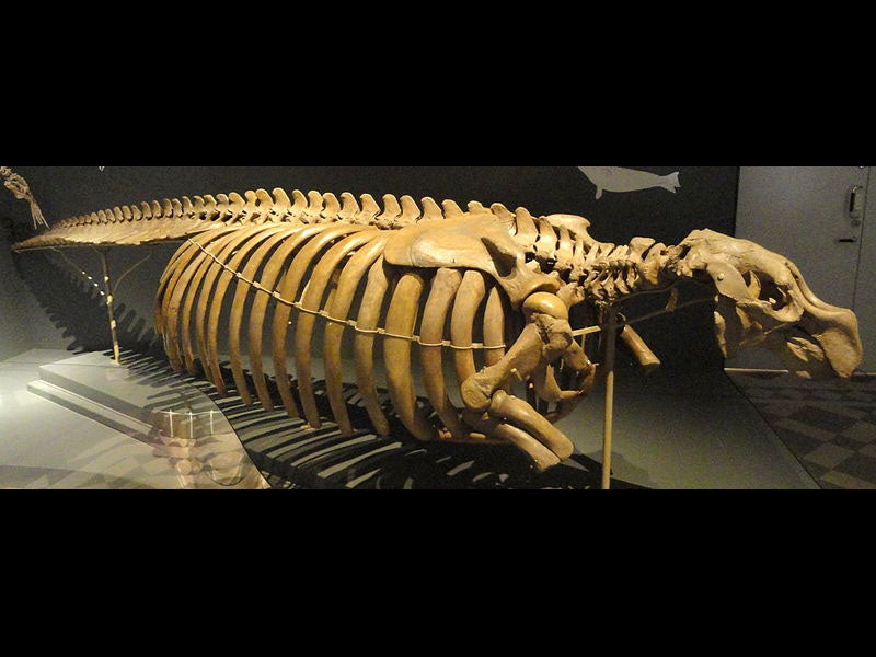 But back to Bering and Steller. On the return voyage, the crew was stranded on Bering Island, in the Commander Chain in the Bering Sea, where they had to overwinter, and most of the crew, including Commander Bering, died of scurvy. But Steller took the opportunity, if that is what it was, to study the animal life, and he was the first to observe the remarkable sea cow now known as Steller's sea cow. It stretched nearly twenty-five feet long, was quite peaceful, and fed on kelp. There is no illustration of Steller’s sea cow in the Fauna Boreali-Americana because, within thirty years of discovery, it had been hunted to extinction. The best we can do is show you a skeleton that has been preserved in the Finnish Museum of Natural History (second image). The Commander Islands are shown on this map (just above the date line) although Bering Island is not marked (third image)