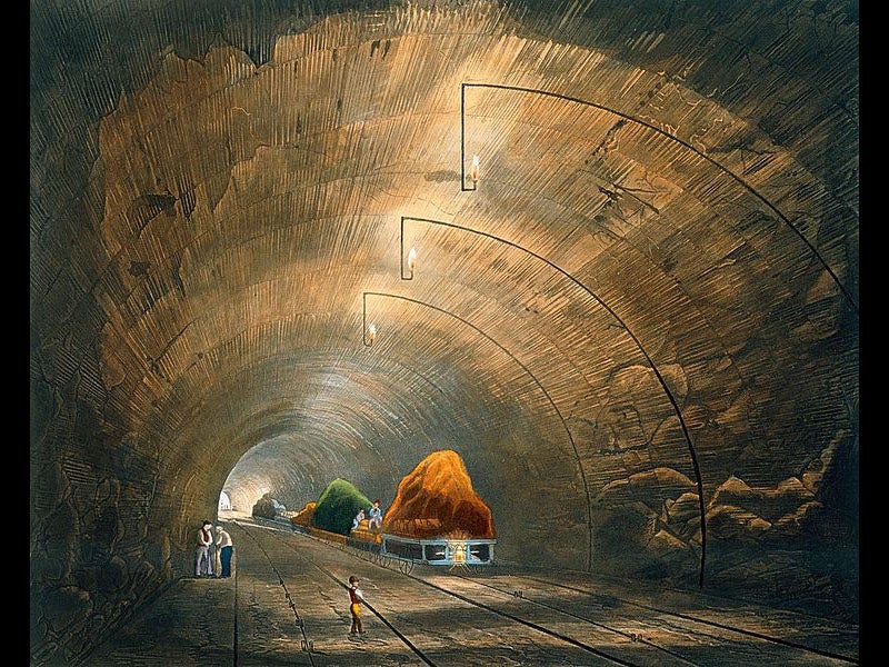 George Stephenson, a British engineer, was born June 9, 1781. Stephenson was as responsible as anyone for the Golden Age of the Railroad, which began when the Liverpool and Manchester Railway opened in the fall of 1830. Stephenson had been building steam locomotives for fifteen years for the collieries (coal mines) of Killingworth, and the idea of shipping not just coal, but passengers and freight, between port cites and manufacturing cities was largely Stephenson's. His firm arranged for (and won) the famous Rainhill Trials in 1829, when a Stephenson locomotive, the Rocket (designed by his son Robert) showed that a moving steam locomotive was superior to a standing engine, or a team of horses, in moving carriages by rail. Stephenson was also largely responsible for the establishment of Mechanical Engineering as a discipline separate from Civil Engineering, serving as the first president of the Institution of Mechanical Engineers, which was founded in 1847. And it is also Stephenson that you have to blame for the fact that the worldwide standard railway gauge is 4 feet 8 1/2 inches. The images above all commemorate opening day of the Liverpool and Manchester Railway, Sep. 15, 1830, showing the first train (first image); Wapping tunnel (second image), the crossing of Chat Moss, an extensive peat bog (third image), and the Rocket, as it sits on display today in the Science Museum in London (fourth image). There is a substantial section on Stephenson, the Rainhill Trials. and the Liverpool and Manchester Railway in Bruce Bradley’s pamphlet for the Library’s 2008 exhibition: Locomotion: Railroads in the Early Age of Steam; the Rocket is on the front cover (fifth image). Dr. William B. Ashworth, Jr., Consultant for the History of Science, Linda Hall Library and Associate Professor, Department of History, University of Missouri-Kansas City. Comments or corrections are welcome; please direct to ashworthw@umkc.edu.