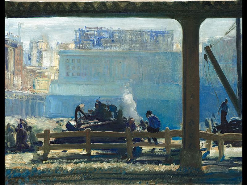 Bellows is often lumped in with a cadre of New York artists known as the Ashcan School, who were not just realists, but gritty realists, going out of their way to capture the dark and seamy side of big-city life, painting prostitutes, dock-workers, slums, saloons, and prize fights (Bellows himself liked to paint boxers in combat). But what is attractive about the Penn Station series is that Bellows is attempting to capture the process of building and engineering—not the final product. Many artists had painted the finished Brooklyn Bridge or the completed Eiffel Tower, but none of them seem interested in the making of structures—that was left to the photographers. Bellows seems not to have cared about completed buildings. The Pennsylvania Station was one of the seven wonders of the modern world when it was finished in 1910, and Bellows never painted it. He preferred capturing the steaming maw out of which the Station slowly grew. And this was unique in 1907. It makes Bellows our first engineering artist, if by “engineering” you mean the process of construction, and not just the end result.