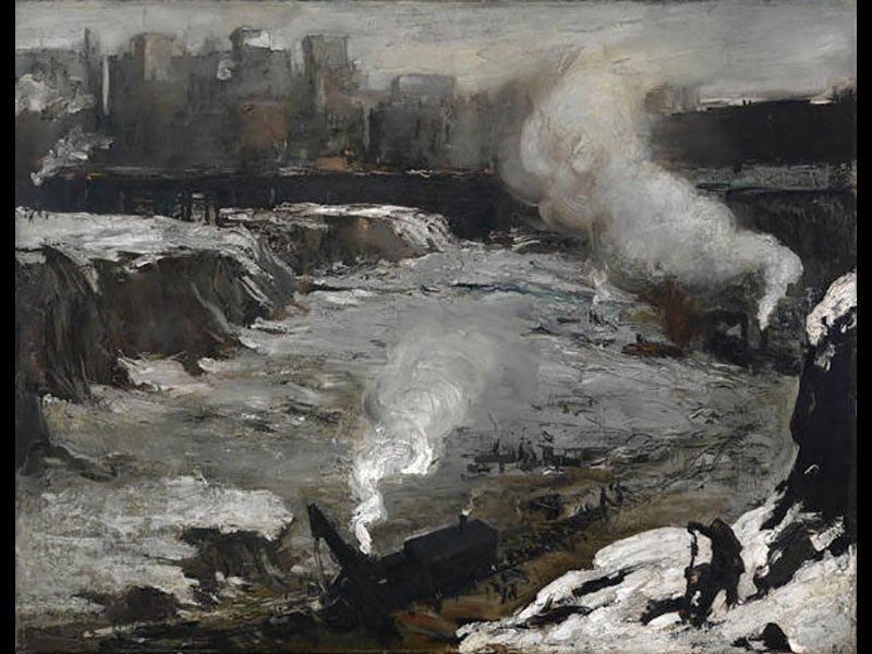 George Wesley Bellows, an American painter, died Jan. 8, 1925, at age 43. Bellows was just 20 years old when Alexander Cassat, president of the Pennsylvania railroad (and brother of painter Mary Cassat), decided it was high time that his trains found a way to get into New York City, rather than terminating in New Jersey on the west bank of the Hudson river. Eight years later there were two long tunnels under the river and a mammoth station, Pennsylvania Station, had arisen on two city blocks between 31st and 33rd street. The project was the largest engineering endeavor ever undertaken in the United States, and most of the labor and expense went into excavating an enormous cavity to allow the tracks from under-river tunnels to connect with the land lines. Bellows arrived in New York from Columbus, Ohio in 1904, when the digging was just underway, and he must have watched this process in awe for several years before deciding to try to capture the digging effort on canvas. He made four paintings of the excavation. The first, called Pennsylvania Excavation (1907), was given to the Smith College Museum of Art a few years ago (second image above). The second, Excavation at Night (1908), is in the Crystal Bridges Museum in Bentonville, Arkansas (first image). The third, Pennsylvania Station Excavation (1907-09), is in the Brooklyn Museum of Art (third image). And the last, Blue Morning, is in the National Gallery of Art (fourth image). The Brooklyn Museum and the Crystal Bridges paintings are the most dramatic, with Excavation at Night impressively so, with the fires and lamplights unable to penetrate the sheer vastness of the audacious hole in the ground.
