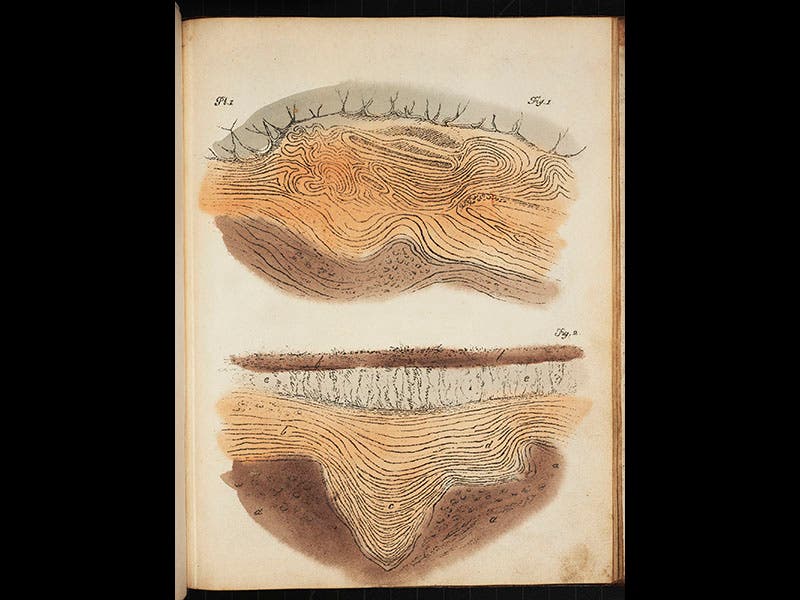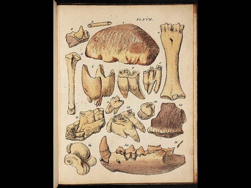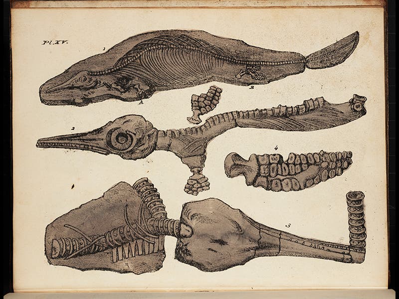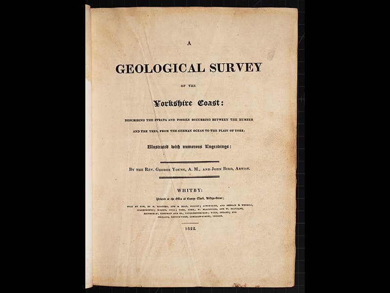 George Young, a Scottish minister and geologist, died May 8, 1848, at the age of 70. Young spent most of his life in Whitby, a port town in Yorkshire, in northern England, notable as the home of whaler William Scoresby and explorer James Cook. Young was a talented geologist--he trained under John Playfair at Edinburgh, who at the time was the foremost defender of the uniformitarian geology of James Hutton—and in 1822, Young published a treatise on his home stomping ground, called A Geological Survey of the Yorkshire Coast. It has a geological map and 17 plates of fossils that he had unearthed in such places as Kirkdale Cave, a cavern that would become much better known when William Buckland explored and discussed it in his Reliquiae Diluvianae of 1823, arguing that it was a prehistoric hyena den. Young, who served as pastor at a Whitby church for 40 years, could not agree, preferring to believe that the fossils were washed into the cave by Noah's flood, and not dragged in by hungry hyenas. Young's geology might not have been cutting edge, but he certainly was in the vanguard when it came to scientific illustration. He chose to illustrate his fossils with lithographs, which were still a brand new art form in England, and his Geological Survey is the third oldest book in our Library to contain lithographs. Accordingly, we included it in our Crayon and Stone exhibition on lithography in 2013. Young was also a founder of the Whitby Museum, and many of the fossils there are probably ones that he himself collected.
