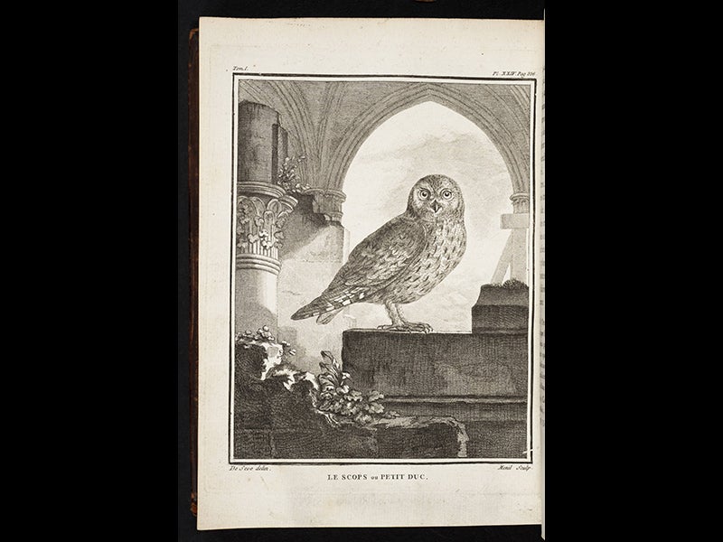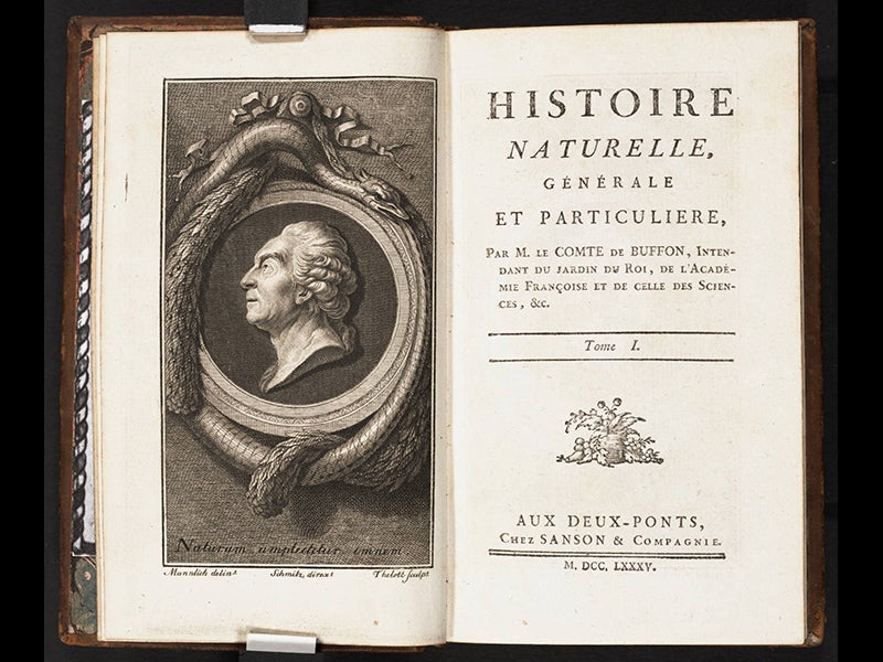 Georges-Louis Leclerc, comte de Buffon, a French naturalist, was born Sep. 7, 1707. Buffon was director of the Royal Botanical Gardens and Menagerie in Paris, and, in that capacity, he began publishing a natural history encyclopedia, the Histoire naturelle. The first volume appeared in 1749, and when Buffon died in 1788, volumes were still rolling off the press at regular intervals. The entire set of 44 volumes and an atlas is a remarkable testament to both vision and persistence. Buffon is best known for his rejection of the taxonomic natural history that was advocated by his exact contemporary, Carl Linnaeus, and for his proposal of an approach to nature that focused on animal communities and ecological relationships rather than classes, orders, and species. Buffon famously said that, in his volumes, the dog follows the horse, because in nature, the dog follows the horse. We have in the Library several sets of Buffon's Histoire naturelle--an original quarto edition, which we made the subject of a special exhibition in 1998, and a beautiful set with smaller volumes and hand-colored plates. This Deux-ponts edition, as we call it from its place of publication, was displayed in our Grandeur of Life exhibition in 2009.