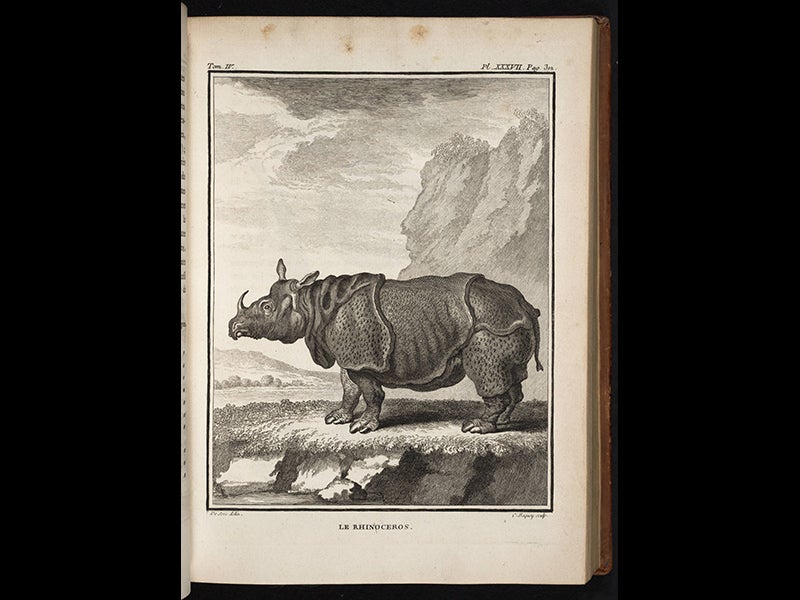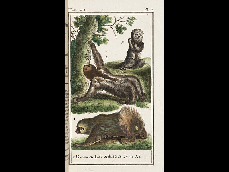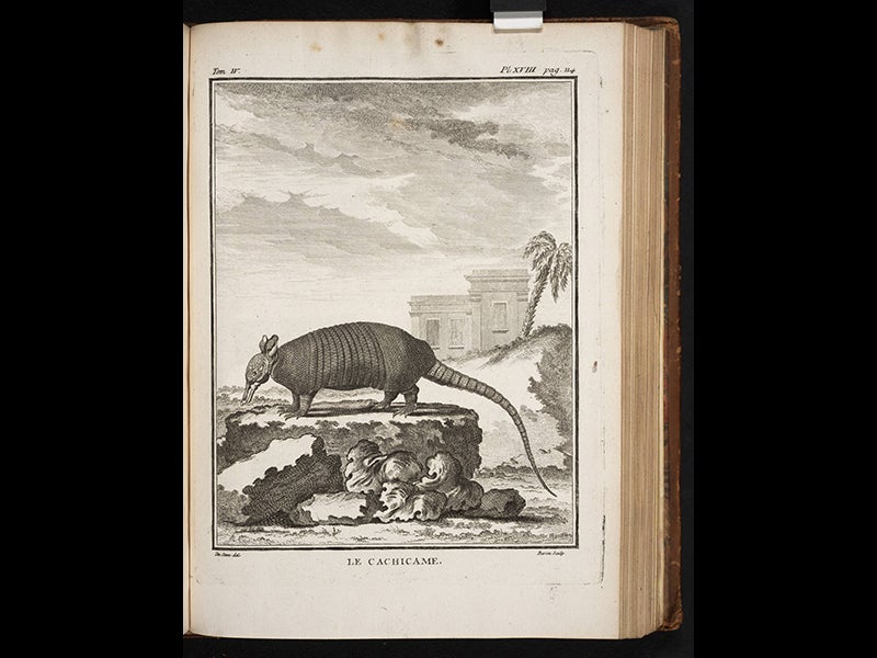 The first four images above are from the first quarto edition (1749-1804) and depict, in order: a chameleon, an owl, Clara the rhino, and a 9-banded armadillo. The last two images are from the Deux-ponts edition (1785-91) and show the title page with Buffon’s portrait opposite, and a plate with several species of sloths.