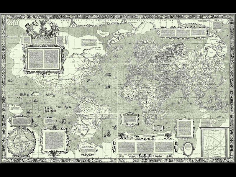 In his own day, Mercator was better known as a globe maker. Globe making was an arduous task; it involved fashioning a large round ball of papier-mâché on a light wooden form, and then engraving and printing flat curved strips, or gores, which had to be carefully pasted on the globe, with the finished production then hand-colored. Mercator collaborated on a terrestrial globe in 1541, and then published on his own a companion celestial globe in 1551; these were so successful that he published many more in his lifetime. Some 22 Mercator globe pairs survive today. You can see one set in the Mercator Museum in Sint-Niklaas in northern Belgium; above we show the terrestrial globe (third image). The celestial globe is from a pair at Oxford (fourth image).