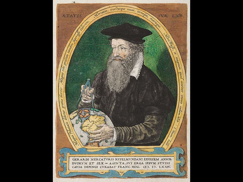Gerard Mercator, a Flemish cartographer, died Dec. 2, 1594. Mercator is best known for devising the Mercator projection, which first appeared on a large world map that he published in 1569 (second image). The original Mercator map, consisting of 18 engraved sheets that could be fitted together to make a wall map some six feet across, is quite scarce--only three copies survive, in Paris, Basel, and Breslau. The Mercator projection was designed so that all rhumb lines (lines in a particular compass direction, such as 43 degrees northeast) can be plotted as straight lines. On every other projection, a rhumb line will curve, sometimes in a quite complicated fashion. The Mercator projection was a boon for navigators. If you wanted to get from the Azores to Brazil, you simply drew a straight line between the two points on the map, measured the angle of intersection of the line with a meridian, and set off in that direction. Assuming the starting and ending points were plotted on the map in their proper geographical position (a big assumption in 1569), and assuming that your compass were accurate, you would arrive at your destination. The only problem comes at high latitudes; in order to keep the rhumb lines straight, the scale has to increase as you go north or south, so that land masses get huge above 70 degrees. But that was not much of a shortcoming in the sixteenth century.