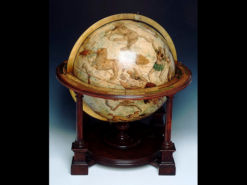 In his own day, Mercator was better known as a globe maker. Globe making was an arduous task; it involved fashioning a large round ball of papier-mâché on a light wooden form, and then engraving and printing flat curved strips, or gores, which had to be carefully pasted on the globe, with the finished production then hand-colored. Mercator collaborated on a terrestrial globe in 1541, and then published on his own a companion celestial globe in 1551; these were so successful that he published many more in his lifetime. Some 22 Mercator globe pairs survive today. You can see one set in the Mercator Museum in Sint-Niklaas in northern Belgium; above we show the terrestrial globe (third image). The celestial globe is from a pair at Oxford (fourth image).