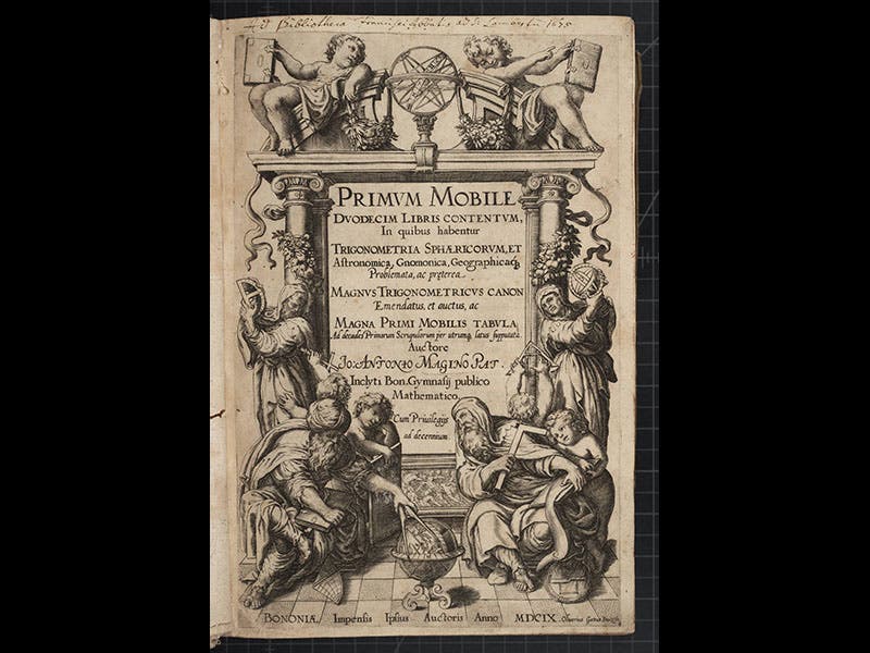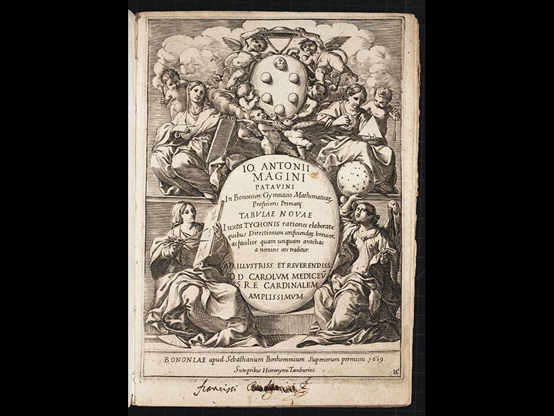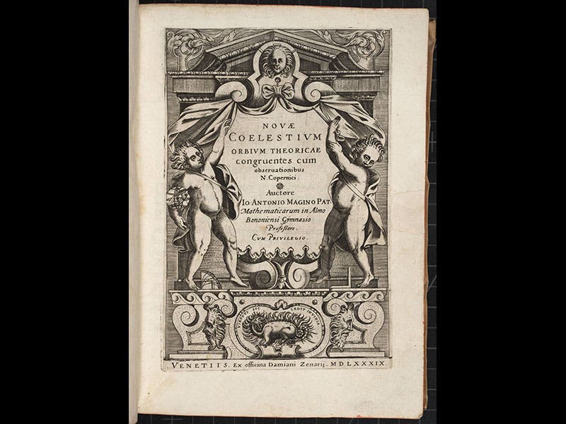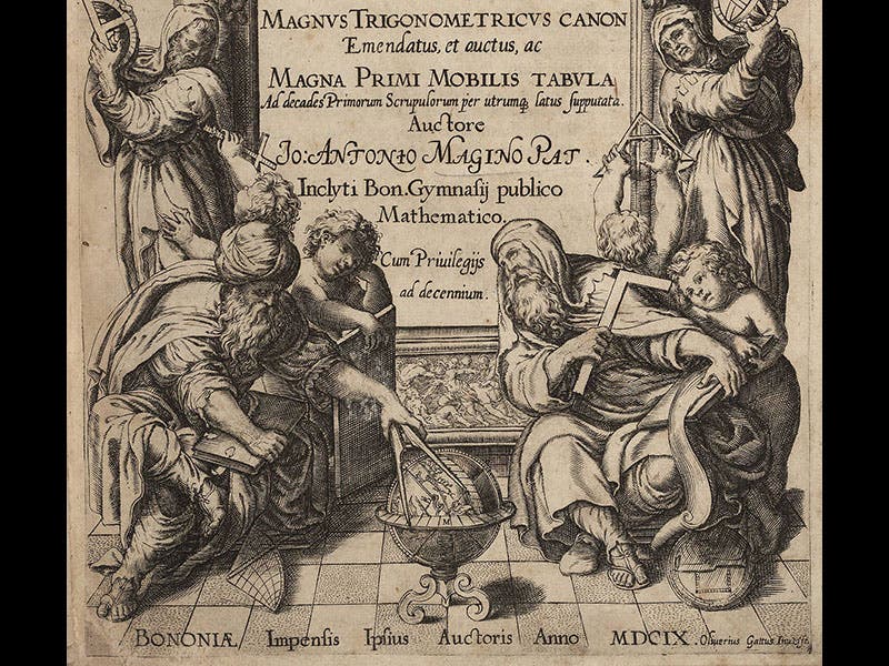 Magini’s tables were very popular and were often updated and reprinted by Magini himself. We do not have his first two publications in our library, the ones that won him his job at Bologna (1582 and 1585), but we have three later editions of these, and since they all sport an engraved title page, we show the title illustrations above. The title-page engraving for his Primum mobile (1609; third and first images), depicting a varied collection of ancient astronomers and mathematicians, is stylistically one of the finest compositions of the first half of the century. We also own Magini’s most important cosmological work, Novae coelestium orbium theoricae, published in 1589 (sixth image), which must have confirmed in the regents’ minds that they had made the right choice in selecting their new professor.