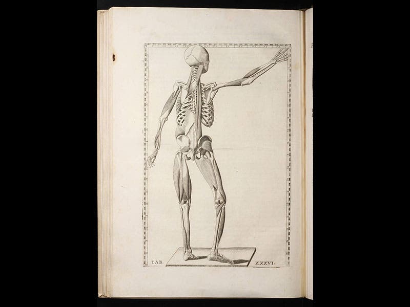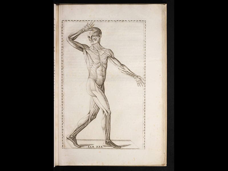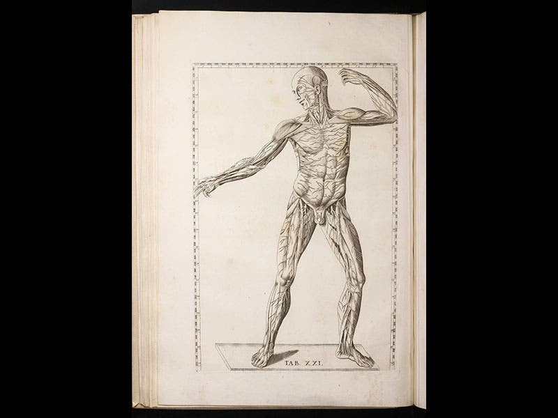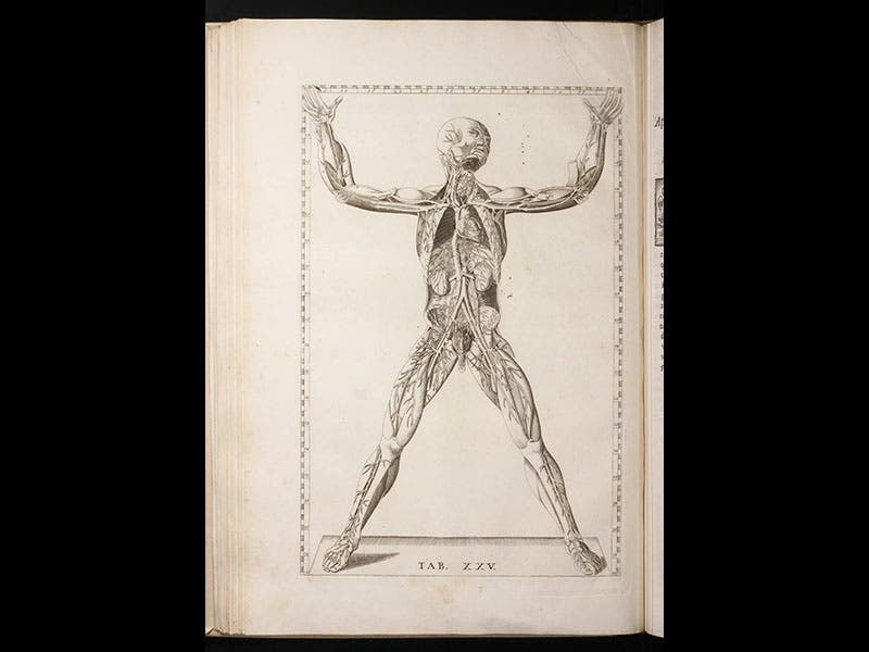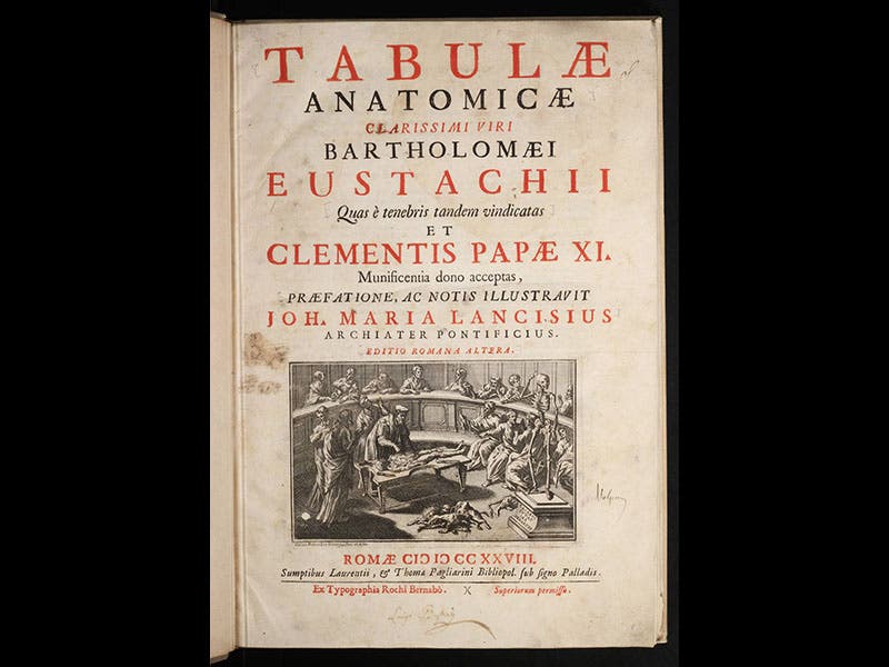 Lancisi unearthed both manuscripts in the Vatican Library, as well as the copper plates that had survived intact. The Eustachi work on anatomy was published first in 1714 as Tabulae anatomicae, and Mercati's Metallotheca appeared in 1717. Both are sumptuous works--they were published under the auspices of Pope Clement XI--and we are fortunate to have copies of each in the History of Science Collection, a 1st edition of Mercati, and a 2nd edition (1728) of Eustachi. Mercati was the Scientist of the Day on Apr. 13, 2016, and we displayed six plates from his book on that occasion. We show plates from the Eustachi work here. These are some of the most remarkable anatomical engravings of the period following the publication of Andreas Vesalius’ De fabrica (1543), and yet the Renaissance never saw them. Were it not for the conscientious efforts of Lancisi, we might never have seen them at all.