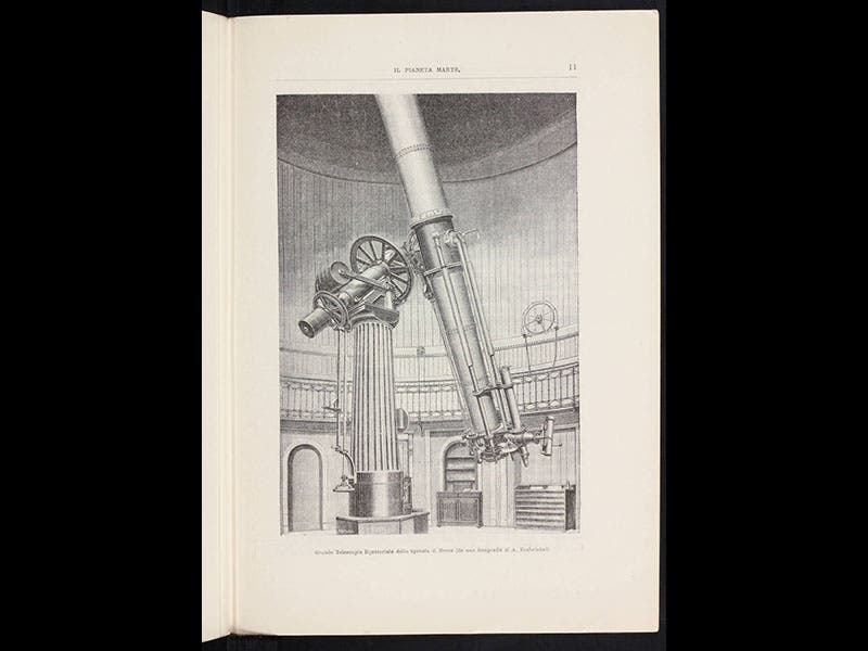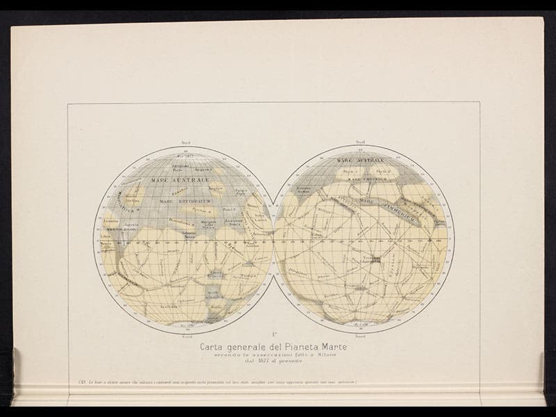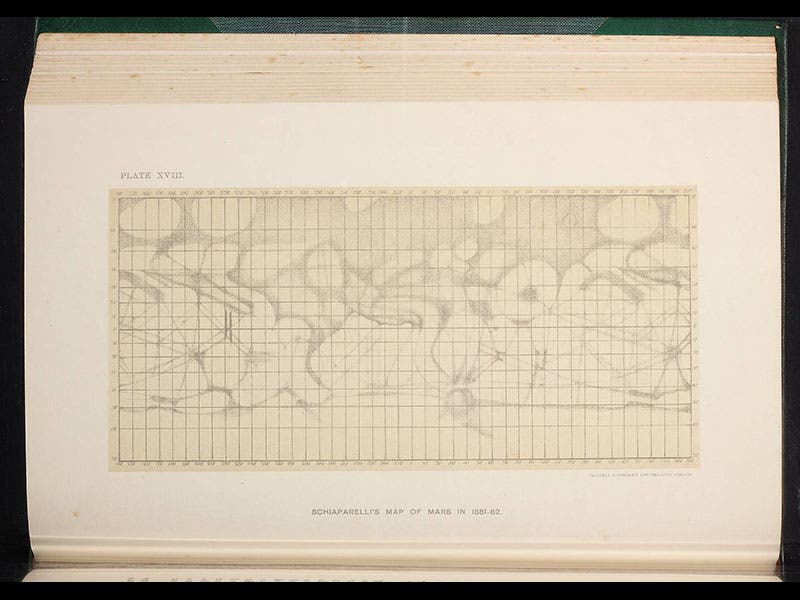 Schiaparelli’s map appeared in several journals that we have in the serials collection of the Library, but the finest version we have is a separate offprint, published in 1893, which was a presentation copy from Schiaparelli to the great German physicist, Ernst Mach. The article also contains a view of the large telescope that Schiaparelli used to make his map. Our last image is a rectangular map of Mars, based on Schiaparelli, as it appeared in The Story of the Heavens (1901), by Sir Robert Stawell Ball.