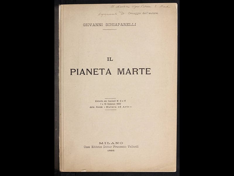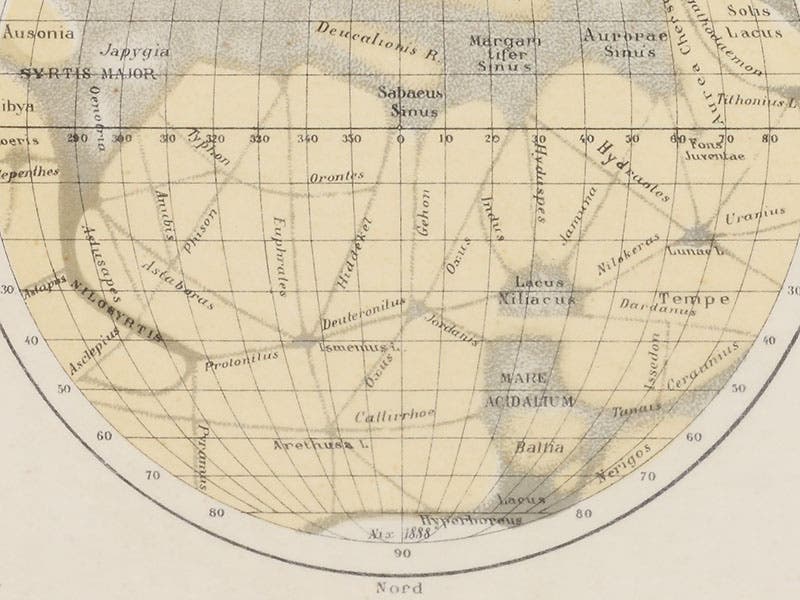 Giovanni Schiaparelli, an Italian astronomer, was born Mar. 14, 1835.  In 1877, Mars passed very close to the Earth, in what we call an opposition, and Schiaparelli, working in Bologna, used the opportunity to study the Martian features in detail. He published the results of his observations in a map that is remarkable for two reasons. First, he proposed a new system of Martian nomenclature, using names from ancient geography, so that the most prominent Martian feature, formerly called the Kaiser Sea, became “Syrtis Major,” and the second most prominent, previously the Terby Sea, was now “Solis Lacus,” the Lake of the Sun. Schiaparelli’s system was adopted and is the basis for the names we still use for the “areography” of the red planet.