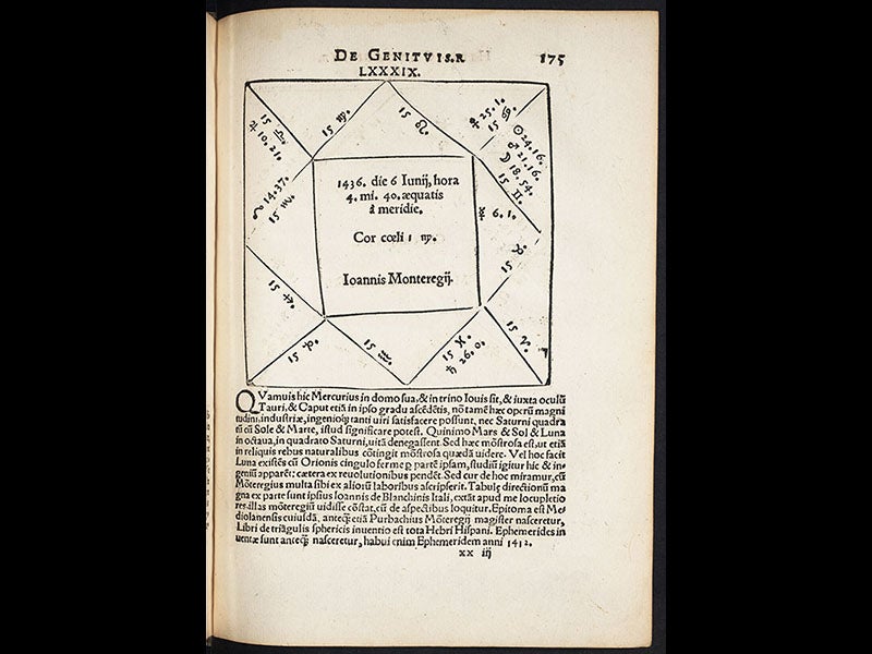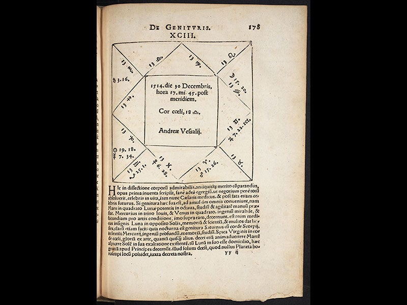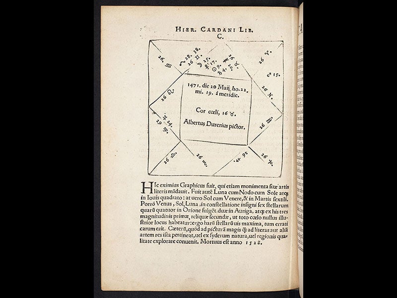 Like many physicians in the Renaissance, Cardano strongly believed in the importance of astrology for practicing medicine, and he wrote several astrological treatises in the 1540s. The Libelli quinque (Five Books, 1547) is especially interesting because it contains the genitures of important Renaissance individuals, including several scientists (a geniture, a specific kind of horoscope, shows the positions of the planets and signs of the zodiac at the moment of birth). We see here the genitures of the great pre-Copernican astronomer Regiomontanus (see second image above), the revolutionary anatomist Vesalius (third image), and the geometer-artist-engraver, Albrecht Dürer (fourth image). There is no horoscope of Cardano in the book, but he does include a portrait of himself on the verso of the title page (first image).