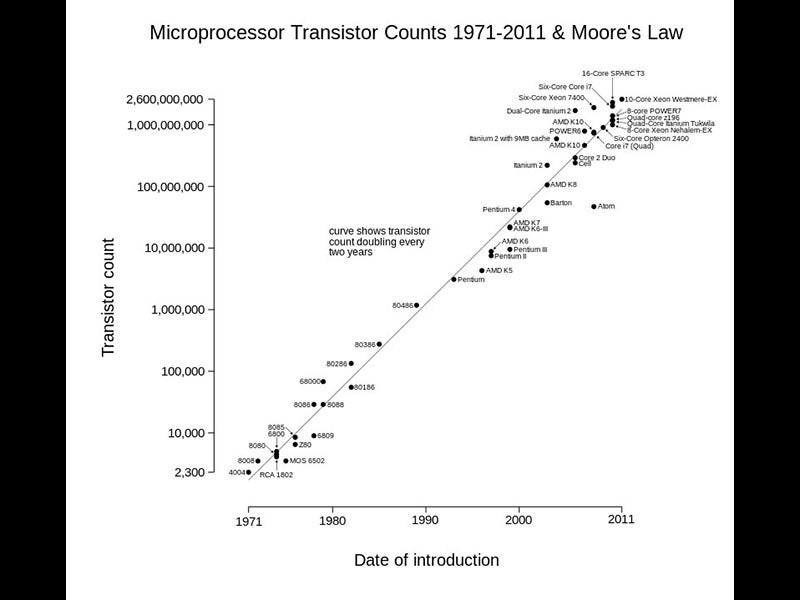 Since 1975, that revised prediction has, amazingly, been borne out, as we see in a graph that shows transistor count per unit area from 1975 to 2011 (fourth image). At some point the predicted trend became known as Moore' Law, although of course it is not a law in the conventional sense. It has been often observed in recent years that Moore's law has now run its course, and that integrated circuit technology development is slowing down. But many have also observed that the demise of Moore's Law has been announced at least four times before, and yet transistor growth still has managed to keep pace with Moore's predictions. At some point, Moore’s Law will probably begin to lose its predictive value. But right now, an obituary would seem decidedly premature.