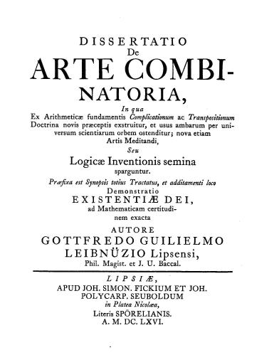 Gottfried Wilhelm (von) Leibniz was born on July 1, 1646 in Leipzig, Germany, and was baptized into the Lutheran Church three days later. Leibniz’ father, a philosophy professor at the University of Leipzig, died when the boy was only seven, leaving him to be raised by his mother Catherina. From that moment on, Leibniz had access to his father’s splendid library of both classical and modern works, most written in Latin and Greek, which the young man soon mastered. At age 15 he entered Leipzig University, where he got his bachelor’s degree in eighteen months, and, in rapid succession, completed a master’s in philosophy, a bachelor’s in law, got his habilitation in philosophy, and, in early 1666 wrote his first book De Arte Combinatoria, which was to introduce topics that would interest – indeed, entrance – him for the rest of his life.