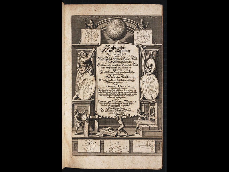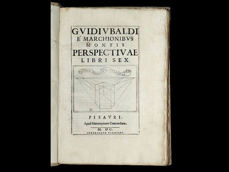 Del Monte published a number of handsome books on Archimedean mechanics there in Pesaro, including his Mechanicorum liber (Book on mechanics, 1577, see first image above) and In duos Archimedis aequeponderantium libros (Archimedes’ Two Books on Floating Bodies, 1588,), as well as books on astronomical instruments (third image) and perspective (fourth image); we are fortunate to have very nice copies of each of them in our History of Science Collection. Nearly all of Del Monte’s books have large title-page vignettes appropriate to the theme of the book; the Mechanicorum liber, for example (first image) has an engraved vignette that illustrates Archimedes’ maxim: give me a place to stand, and I will move the earth.