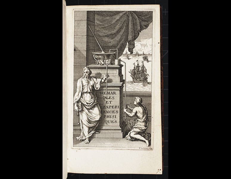 Amontons published a number of papers in the Journal des Sçavans, but only one book: Remarques et experiences phisiques sur la construction d'une nouvelle clepsidre, sur les barometres, termometres, & higrometres (Remarks and physical experiments on the construction of a new water clock, and on barometers, thermometers, and hygrometers, 1695, second image). We have this book in our History of Science Collection; it has a handsome frontispiece that shows his new clepsydra, which supposedly would work on a ship at sea (first image), but most of the book, and all of the plates at the end, depict and discuss a variety of barometers and thermometers, including the three we mentioned briefly at the outset. The most remarkable feature of our copy of the book is the way the plates are mounted: they are glued face-down and upside-down to stubs at the top, rather than at the left, so that the plates unfold upward (fourth image).