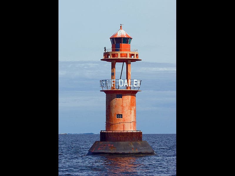 Second, Dalén invented a mechanism that enabled an acetylene flame to be turned on and off in fractions of a second, not only saving fuel, but allowing the beacon to flash, thus giving a signature to each lighthouse, so you could tell them apart at night. Finally, Dalén invented the sunlight valve, an ingenious contraption that would turn a gas flame off when the sun came up, and back on when it got dark. The key was a set of rods, the central one black, the outer ones reflective, all connected to the valve. When the dark rod was exposed to sunlight, it expanded more than the shiny rods, and this differential expansion closed the valve, and as long as the sun shone on the dark rod, it stayed closed. In a photo of a Dalén acetylene lamp, the sunlight valve is the small shiny object sticking up in the air (fourth image).