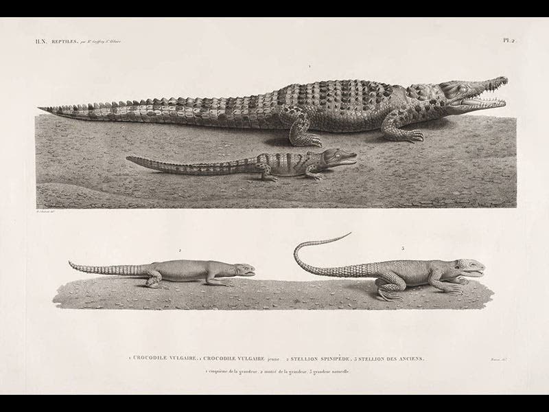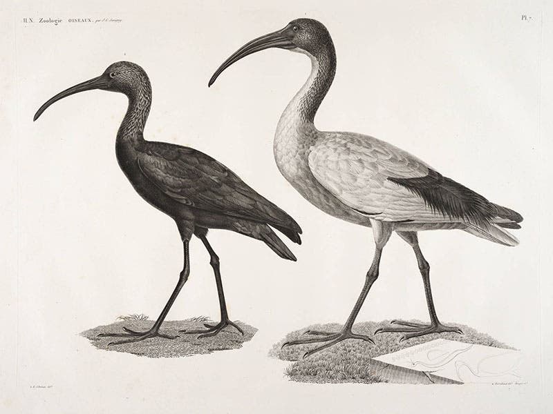 Henri-Joseph Redouté, a Belgian artist, was born May 25, 1766. Henri-Joseph was the younger brother of Pierre-Joseph, also an artist, who would become quite famous for painting the roses, lilies, and other flowers of Malmaison, the estate of Napoleon's wife, Josephine (we featured Pierre-Joseph as a Scientist of the Day on June 20, 2016). But Henri-Joseph had an opportunity that was denied his brother; he was invited to accompany Napoleon on his 1798 invasion of Egypt, as one of about 150 savants and artists who were to capture the country much more effectively with their measurements and sketches than Napoleon's armies, who did not have much luck at their task. Henri-Joseph functioned primarily as a zoological artist, drawing ibises, crocodiles, spiny-tailed lizards, and electric fish, and many of his sketches were engraved as illustrations for the magnificent Description de l’Égypte, published between 1809 and 1828 (second and third images above).