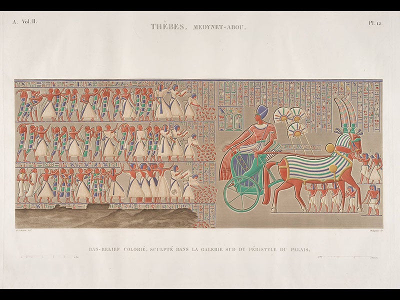 Occasionally Redouté was given the chance to sketch antiquities, a pleasurable task that was usually co-opted by one of the many engineers, and several of Redouté's drawings made their way into the Description. He drew a colossus found at Luxor, from the front and the side (fourth image) and he also copied a bas-relief in the royal palace at Medinet Habu, which was printed in glorious color in the Description. We show above both a detail (first image) and the entire engraving (fifth image).