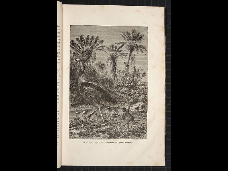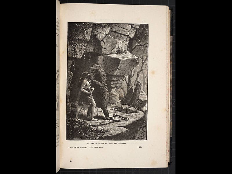 Henri Raison du Cleuziou, a French archaeologist and historian, was born June 19, 1833. In 1887, du Cleuziou published a book called La création de l'homme et les premiers āges de humanité. This was not the first book to include prehistoric humans in a history of humankind--Louis Figuier had done that in 1870--but it is certainly the most extensive such compilation to appear in the 19th century. Du Cleuziou provides the reader with dozens of quarto-sized wood-engravings of Mousterian tool-makers, Magdalenian burials, and even a Neanderthal battling a cave bear for homesteading rights. The latter is a particularly striking scene (see first image above). Notice that the artist has carefully placed Neanderthal bones and cave bear bones on the floor of the cave in the foreground, thus displaying the evidence that allows one to make reconstructions like this. Other wood engravings shown above depict the hunting of a Dinornis (an extinct giant bird; second image), a ceremonial burial (third image), and a gathering around a fire in a cave (fourth image). You can see a fifth plate, showing a very primitive-looking Pithecanthropus, at our online exhibition, Blade and Bone: The Discovery of Human Antiquity (2012). Dr. William B. Ashworth, Jr., Consultant for the History of Science, Linda Hall Library and Associate Professor, Department of History, University of Missouri-Kansas City. Comments or corrections are welcome; please direct to ashworthw@umkc.edu.