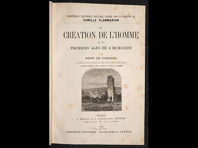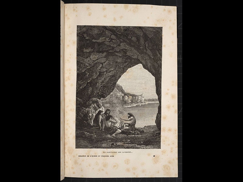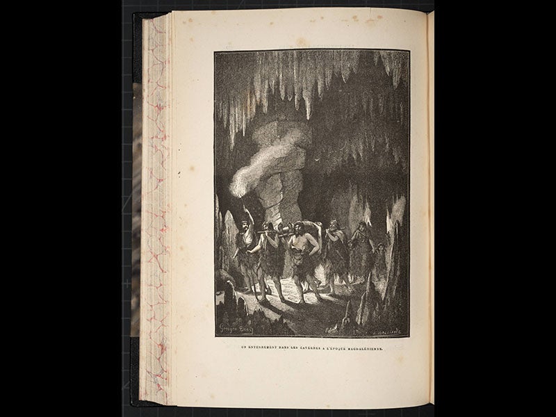 Henri Raison du Cleuziou, a French archaeologist and historian, was born June 19, 1833. In 1887, du Cleuziou published a book called La création de l'homme et les premiers āges de humanité. This was not the first book to include prehistoric humans in a history of humankind--Louis Figuier had done that in 1870--but it is certainly the most extensive such compilation to appear in the 19th century. Du Cleuziou provides the reader with dozens of quarto-sized wood-engravings of Mousterian tool-makers, Magdalenian burials, and even a Neanderthal battling a cave bear for homesteading rights. The latter is a particularly striking scene (see first image above). Notice that the artist has carefully placed Neanderthal bones and cave bear bones on the floor of the cave in the foreground, thus displaying the evidence that allows one to make reconstructions like this. Other wood engravings shown above depict the hunting of a Dinornis (an extinct giant bird; second image), a ceremonial burial (third image), and a gathering around a fire in a cave (fourth image). You can see a fifth plate, showing a very primitive-looking Pithecanthropus, at our online exhibition, Blade and Bone: The Discovery of Human Antiquity (2012). Dr. William B. Ashworth, Jr., Consultant for the History of Science, Linda Hall Library and Associate Professor, Department of History, University of Missouri-Kansas City. Comments or corrections are welcome; please direct to ashworthw@umkc.edu.